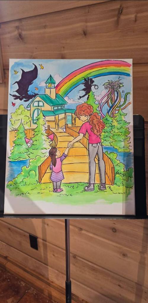 South Whidbey High School freshman Luna Bartholomew submitted two artworks for the Youth of Color Collective show. Both depict the Rainbow Bridge, a Waldorf School tradition that symbolizes the transition of kindergarteners into first graders, who are welcomed by an older student. In one version, Bartholomew is the younger student, while in the other, she is the older student.