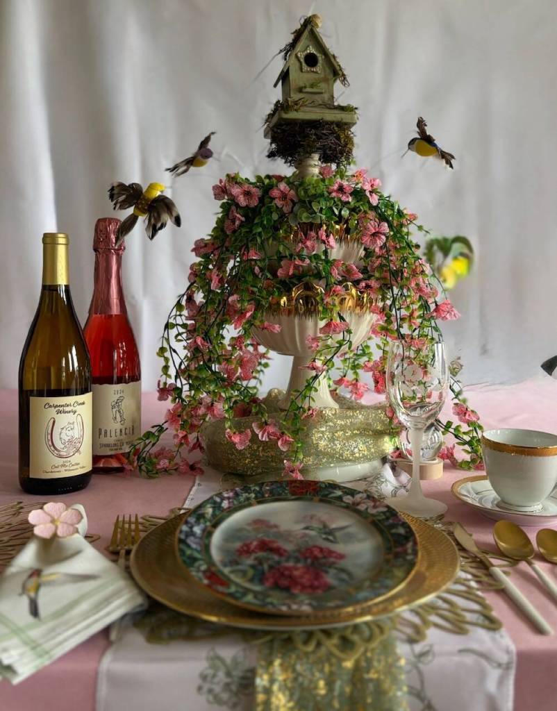 Marilyn Clay, another tablescaper, said her table is mid-century themed and borrows Oak Harbor High School’s purple-and-gold color scheme. Gold-rimmed china, a purple tablecloth and pearl napkin rings are some of the highlights of her tablescape.