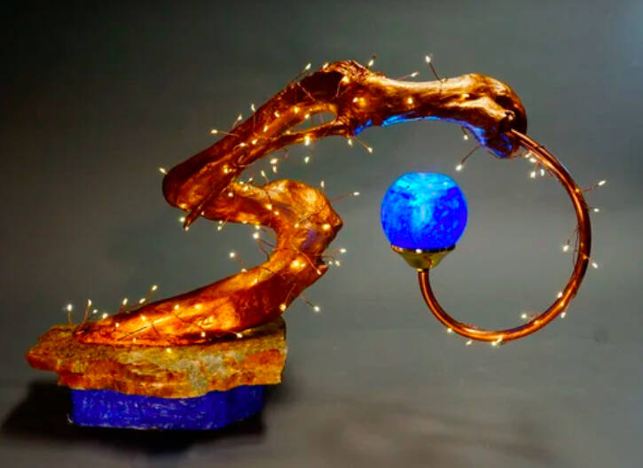 Across the gallery, Spencer’s work adds a mechanical twist to the theme of joy with his whimsical steampunk lamps. Along with his lamps, he also has comedic sculptures on display, each carrying its own narrative, and reinforcing the lighthearted tone he aims to share with his work.