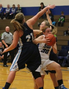 Falcon sophomore Emily Turpin squeezes between Sultan’s Bailey Brierbrauer and Hanna Brierbrauer on Jan. 16 at South Whidbey High School.