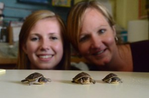 Jessica Dunn and Debbie Wilkie pose for a picture with three turtles at Critters & Co. Pet Center in Clinton. The turtles are similar to the three tortoises that were stolen from the pet shop late last month.