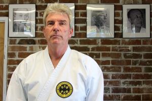 Kyle Jensen / The Record Sensei Warren Berto stands in front of photos of his senseis, who are part of the direct lineage of the Seibukan karate style.