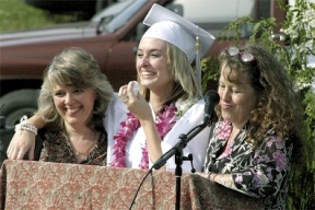Bayview School counselor Charlene Suzuki and former director Dianne Moondancer flank graduate Alexandra Kegley during Thursday commencement ceremony.