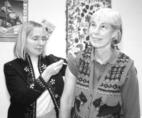 South Whidbey resident Lisa Bjork receives a flu vaccine from Shannon McDonnell at the South Whidbey Health Department yesterday. Bjork was one of about 100 people who poured through clinic doors beginning at 1 p.m. for one of the remaining doses still available. Health department officials divided the remaining doses available between Coupeville