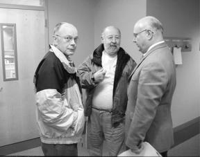 Holmes Harbor Sewer District commissioners Stan Walker and Jim Gervais talk with the district's attorney