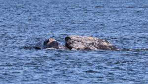 Gray whales, here shown in Saratoga Passage in 2019, wait until high tide then move closer to shore to suction feed for burrowing shrimp in tidelands. Photo by Jill Hein