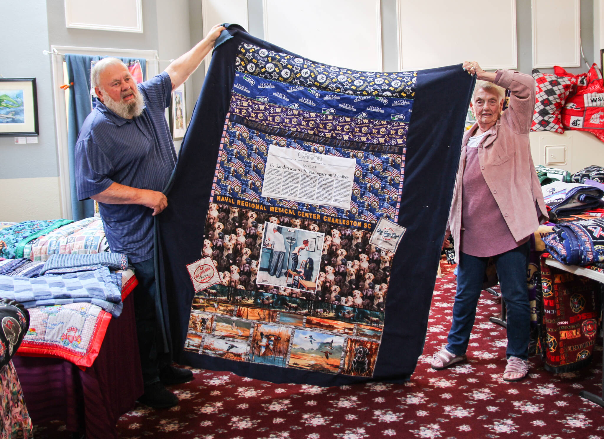 For his retirement, she chose to tell his story and passions, sewing together fabrics with various prints, including his favorite teams, the Seahawks and the Seattle Mariners; his school, the University of Washington; his favorite dogs, labs; the U.S. Navy, as he served in Charleston and on Whidbey; his hobby, hunting.