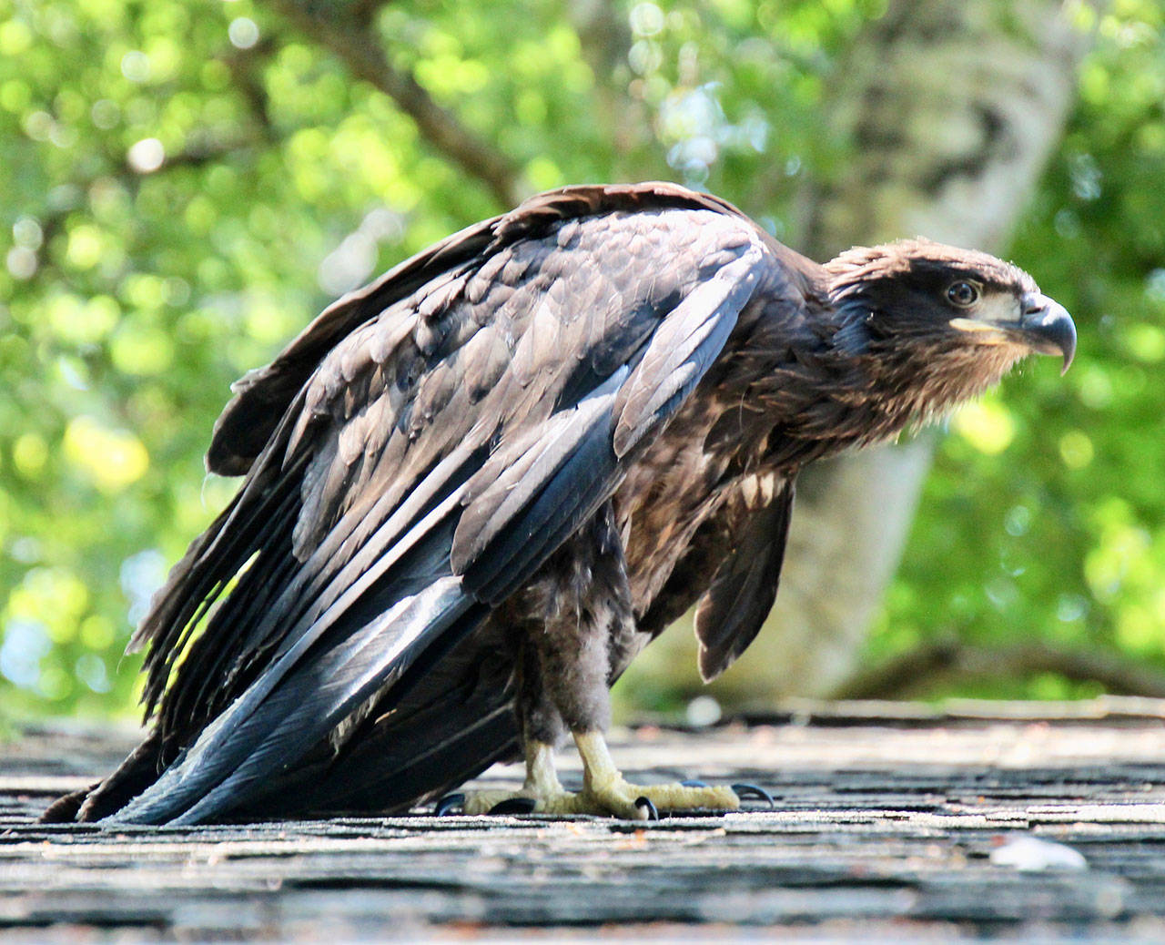 Clinton resident Melissa Koch got a close look at America’s most patriotic bird after discovering a young bald eagle pecking at her hydrangeas Aug. 7. The juvenile eagle appeared to have fallen from a tall nearby fir tree where a pair of nesting bald eagles hatched baby eagles earlier this year, she said.