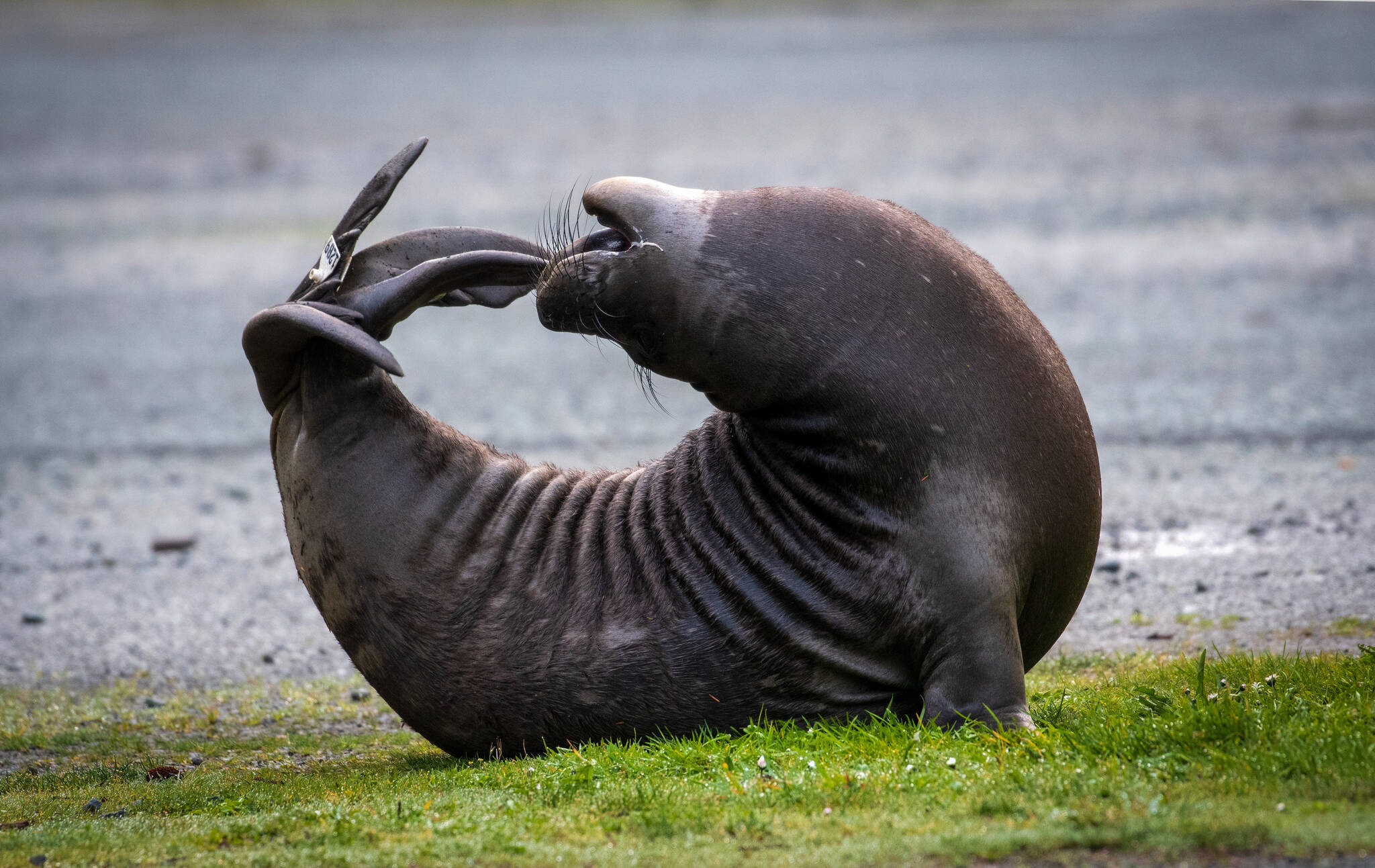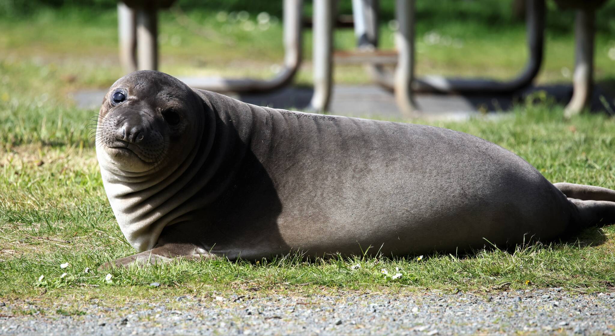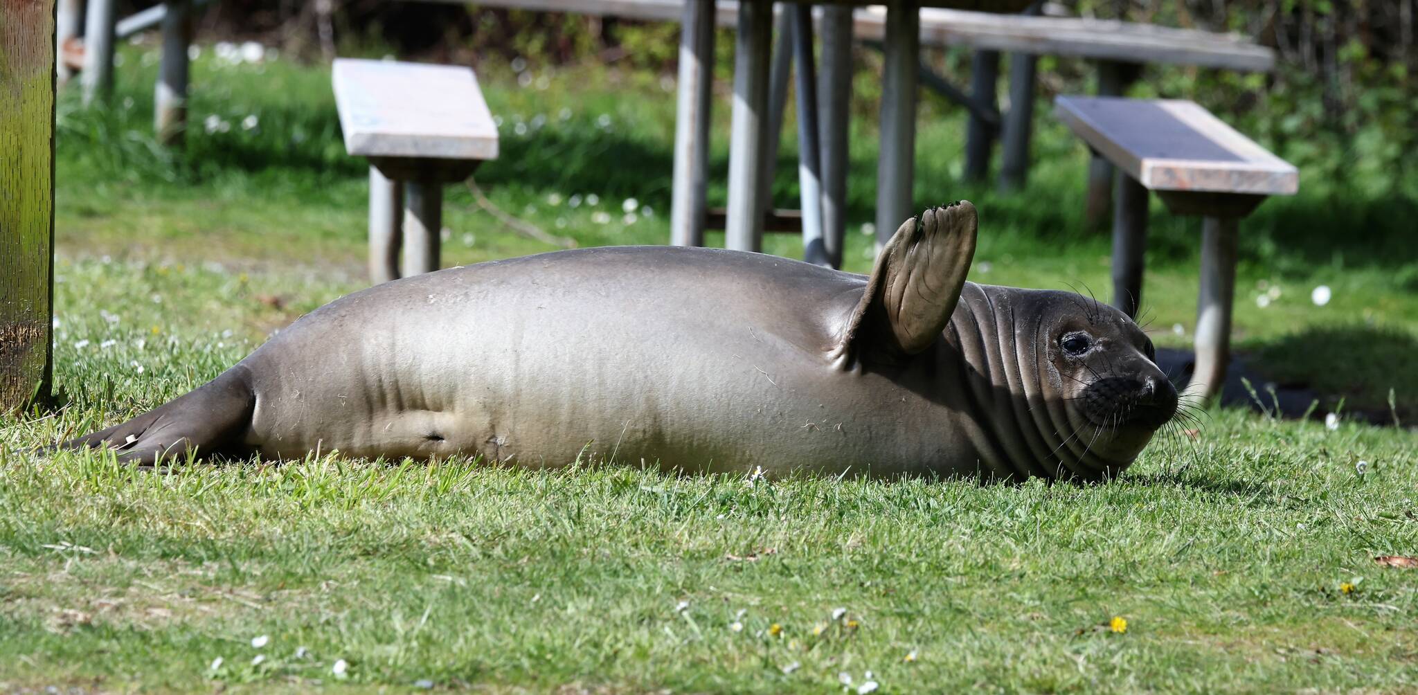 Emerson the elephant seal pup has finished his first molt and is preparing for a life at sea. Though the section of Deception Pass State Park where he was born has been reopened, Orca Network volunteers and park staff are still working to keep a moving barrier around the pup and instruct park visitors to always maintain a distance of at least 50 yards. This photo was taken with a long lens from a respectful distance.