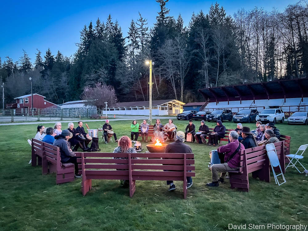 Around 50 people from a few months old to seniors encircled a propane fire pit by a historic barn in the Whidbey Island Fairgrounds to mark the season with rhythm. They came with hand drums, toms, five-gallon buckets, shakers, cowbells, glass bottles and more. The weather prevailed, and at one point a shooting star flew across the clear sky.