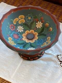 According to lodge member Brian Petersen, Rosemaling developed when painters would decorate interior walls and beams with floral and scroll designs. Eventually, artists began using the style to decorate bowls and baskets.