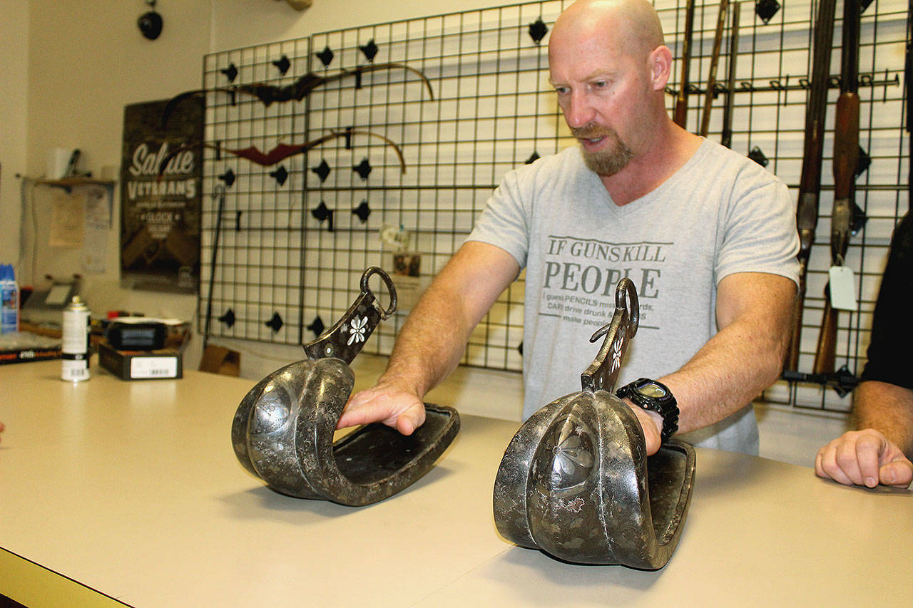 As if the ancient cannon with a storied past isn’t intriguing enough, the storage locker discovered by Norris also contained a pair of samurai warrior stirrups from the 1500s to 1600s, he said. The shop armorer at Whidbey Arms, military veteran Sherman “Smitty” Smith, points out the intricate scrollwork and decorative engravings on the stirrups, which is a trademark of Japanese craftsmanship.
