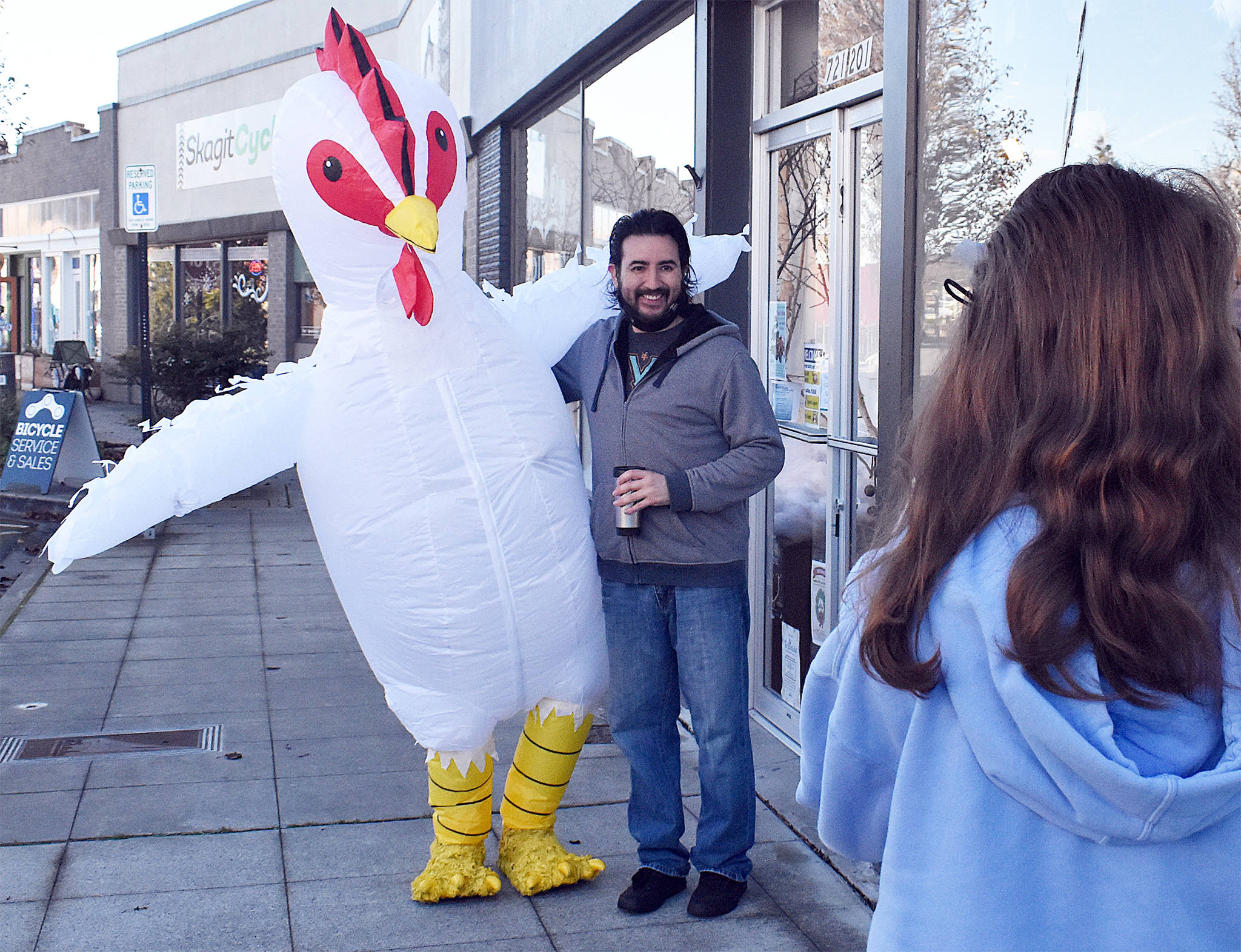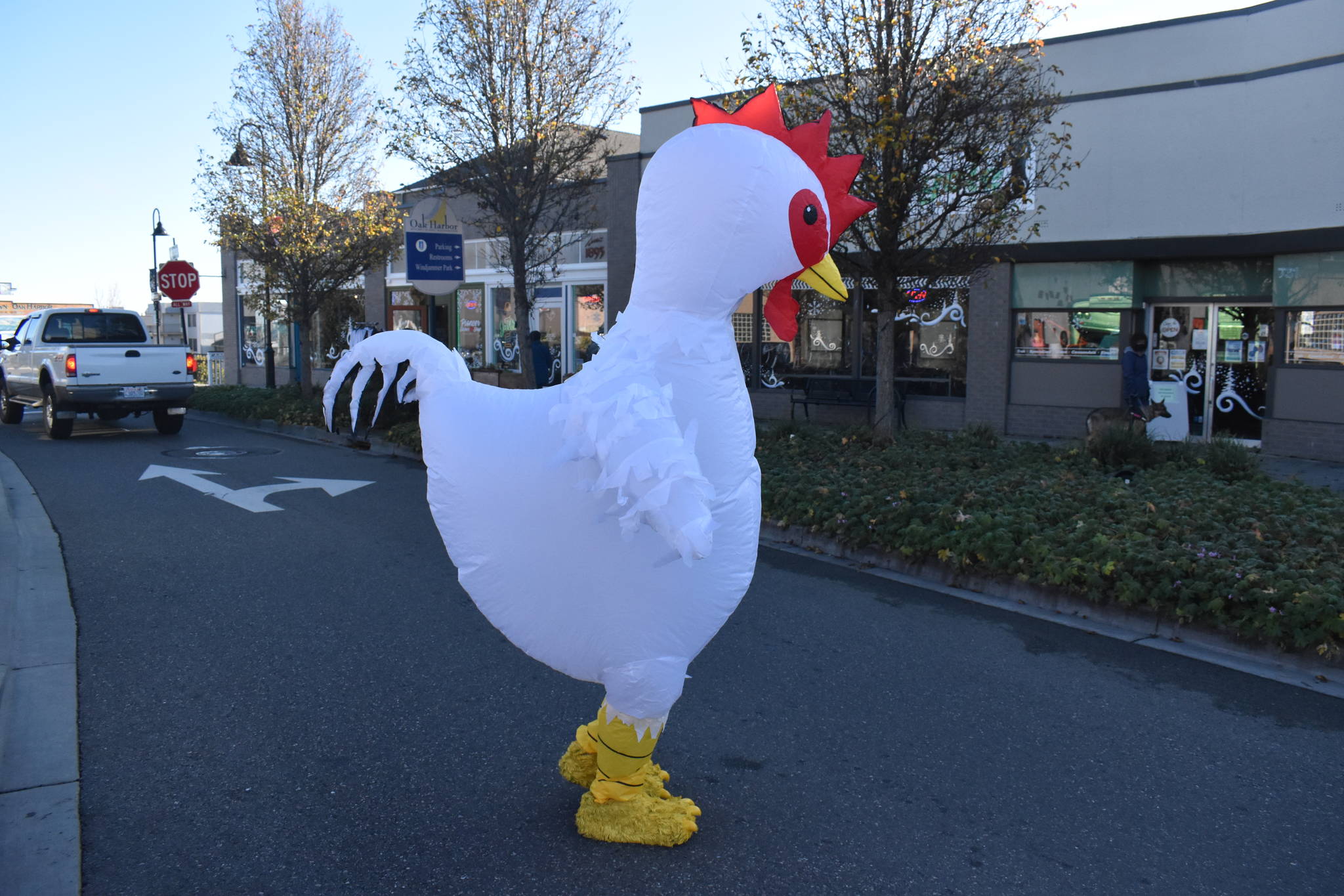 One does not contact the Whidbey Island Chicken for an interview directly; the chicken finds you. He said he did not intend to become famous when he bought the 8-foot-tall inflatable costume before Halloween.