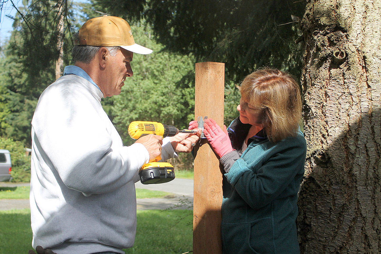 Across the street, another work party was building a 70-foot fence and woodshed for a homeowner “that needs privacy,” Rusty Palmer said, a volunteer who is also chief of South Whidbey Fire/EMS. The four-person crew included Palmer, Suzi Prentiss, Doug Leland and Adam Breedlove.