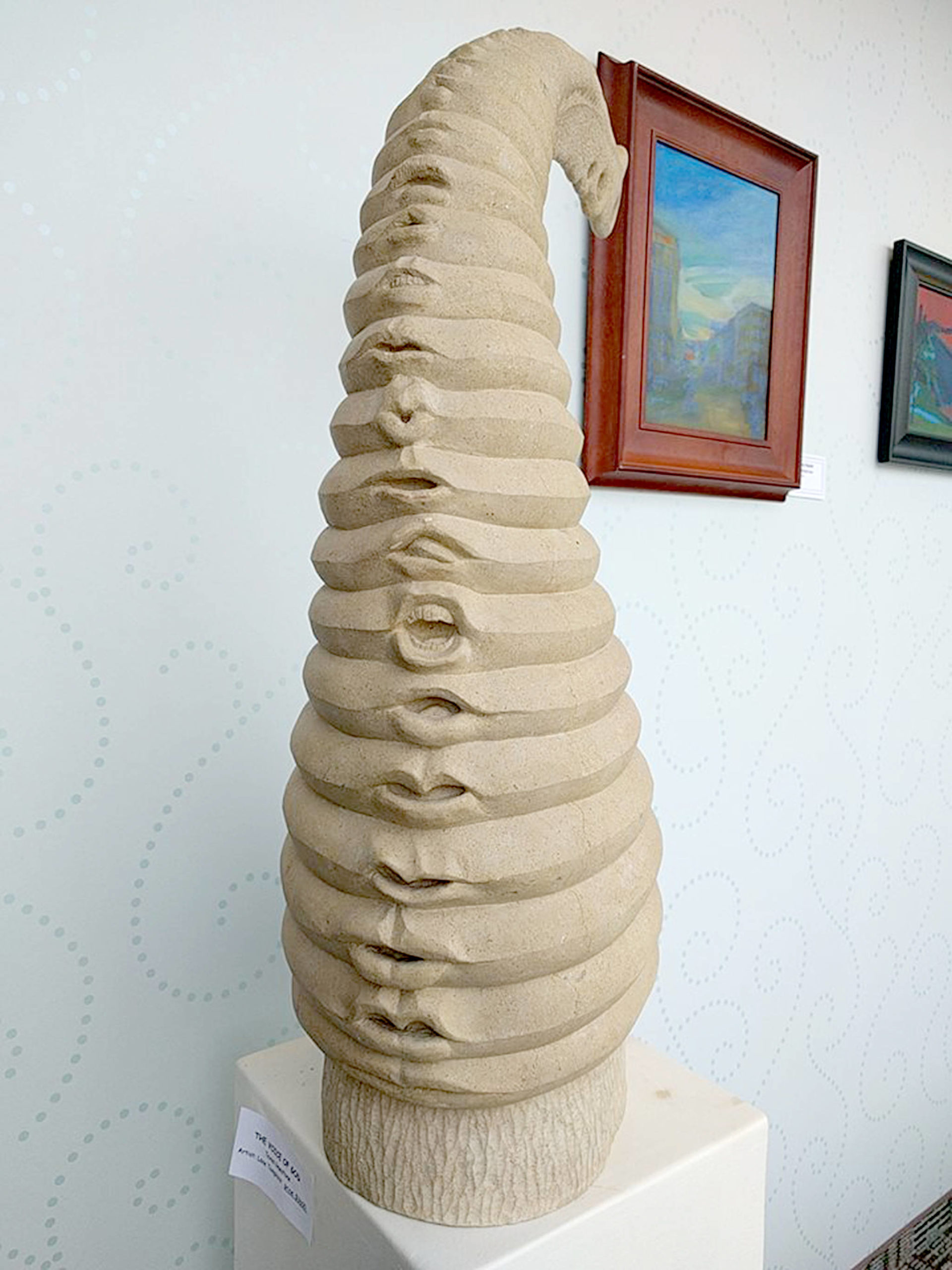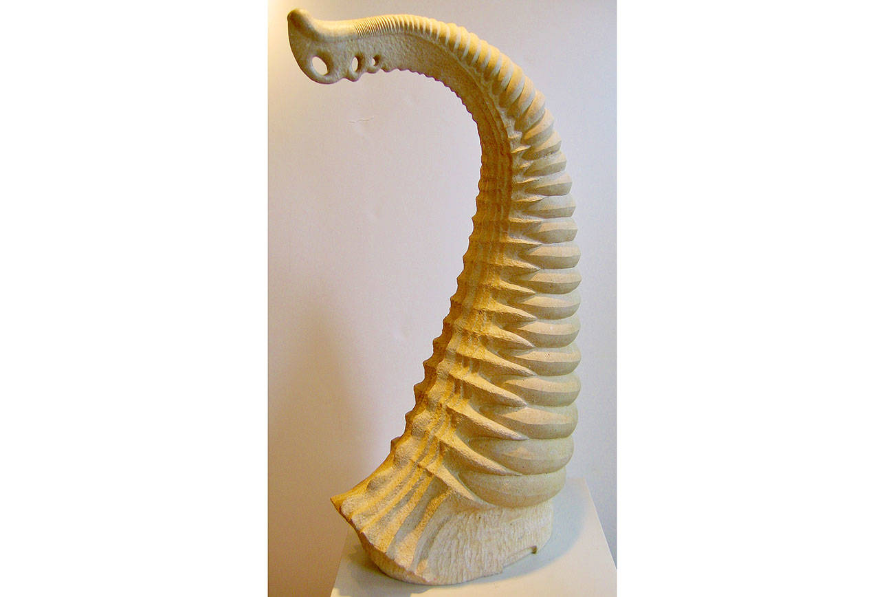 The sculpture is made of Texas limestone and was carved in 2007. It is curved like an elephant’s trunk and resembles vertebrae on one side.