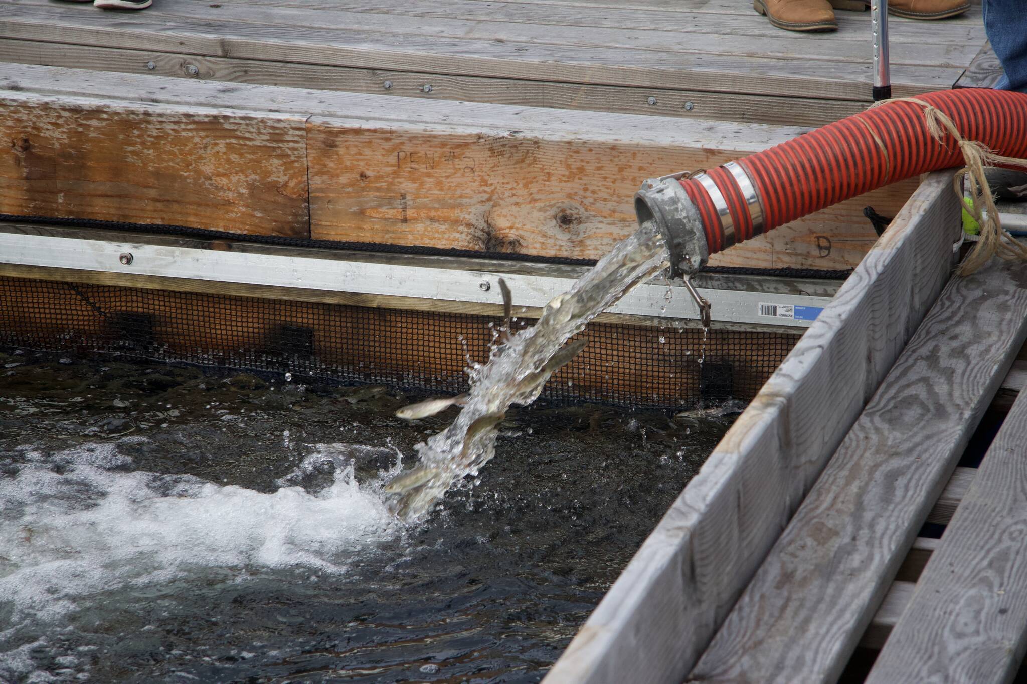 The fish were transported from Marblemount in a large tank on the back of a truck and traveled down several feet of tubing to splash into their new home. Each pen received 15,000 juvenile coho salmon for a grand total of 30,000.