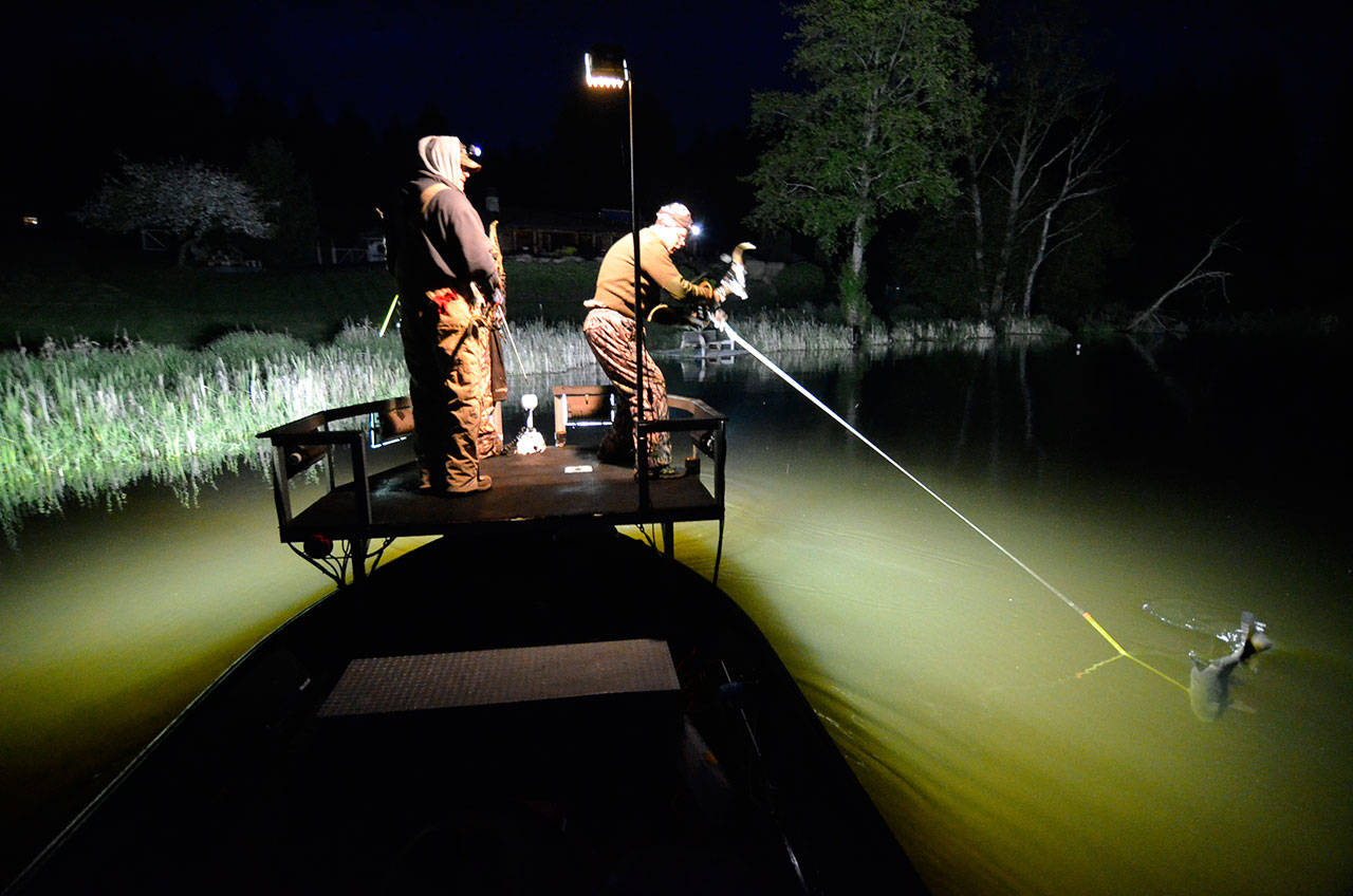 Joining Johnson was Dylan Zugschwerdt of Renton and Jim Lamphere of Redmond. Despite the light rain, chilly breeze and equipment problems — a busted generated forced them to retire early — the three bowman clearly enjoyed themselves. Bow fishing is exciting, they say, and is increasingly popular.