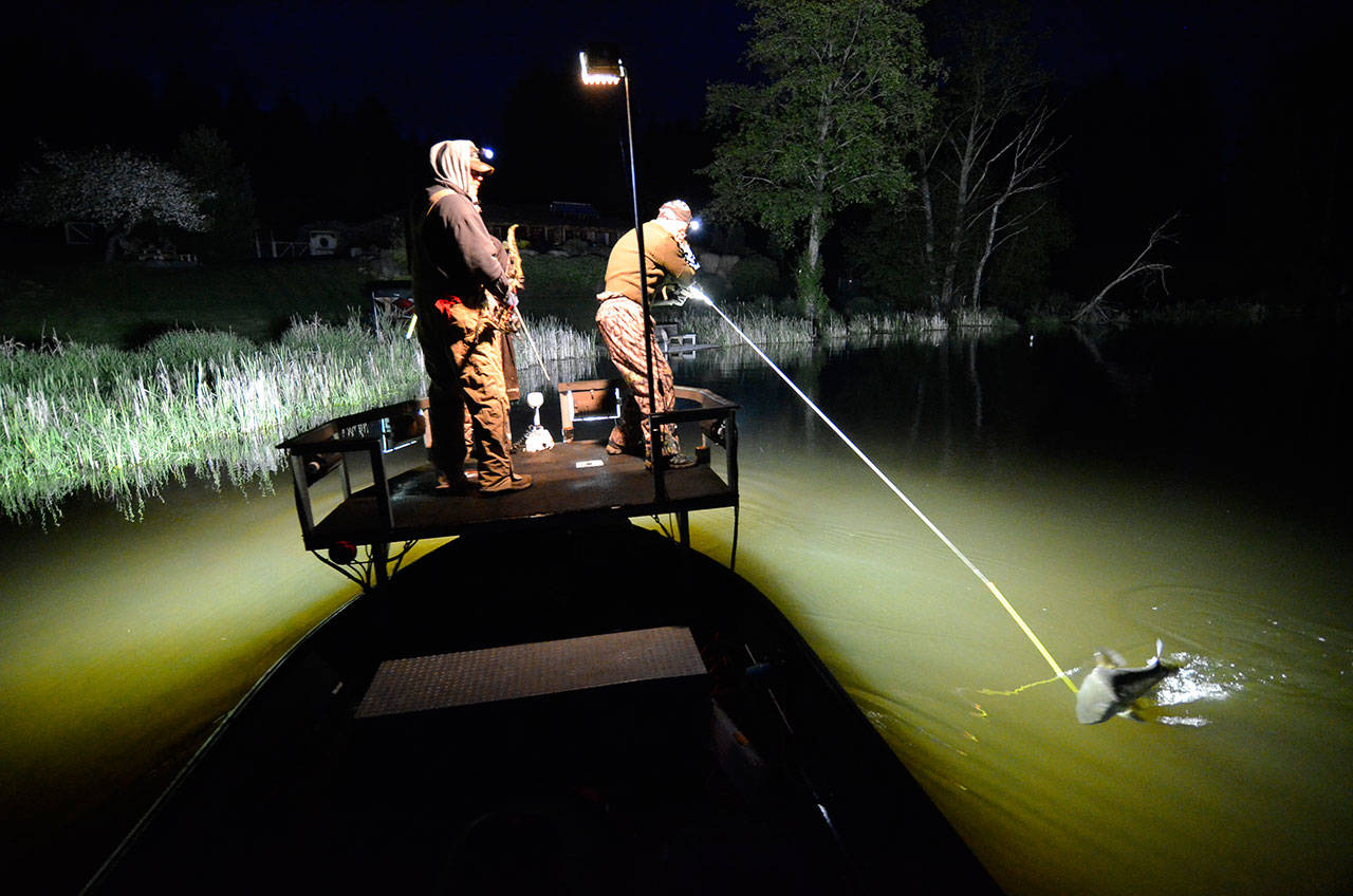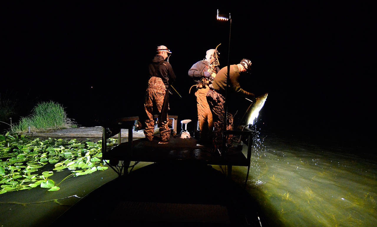 He was one of three bow fishermen who splashed into Lone Lake last week aboard a customized aluminum boat. Outfitted with a large shooting platform on the bow and rigged with powerful lights, the vessel patrolled the shallows looking for slumbering carp. The lights seem to stun or dull the fish for a few precious seconds so the fisherman can fire off a shot with compound bows equipped with reels and 200-pound test line. If their aim is true, the fisherman half reel, half muscle the carp in.
