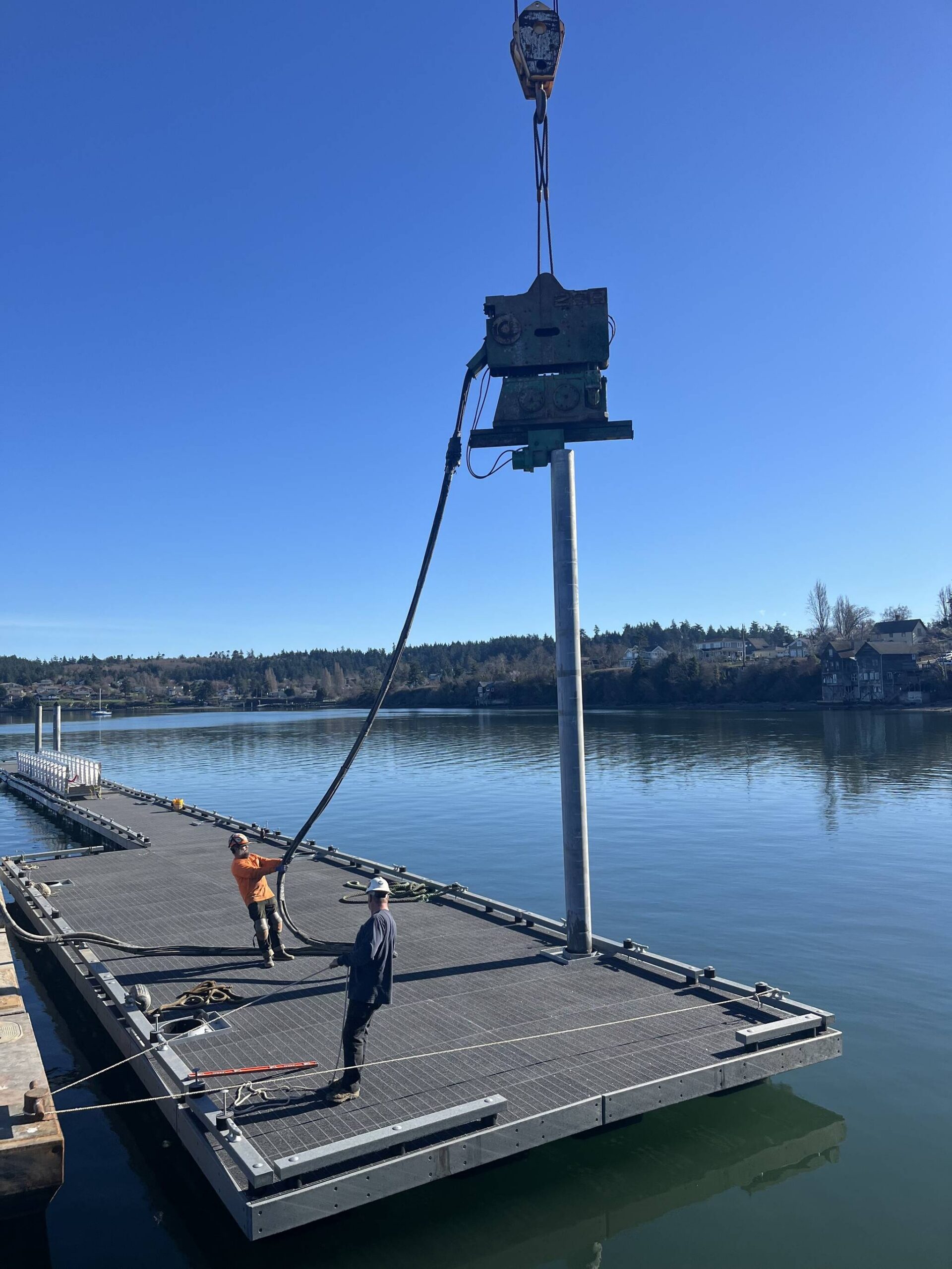 Uninstalling and replacing the old dock took Carlson Construction four days. The new dock was floated to the wharf on a barge and set into place with a crane. Piles were vibrated into place, Michalopoulos explained, reducing the loud noise typical of hammered pile driving which can be disruptive to marine life. Marine biologists on-site kept a lookout for whales entering Penn Cove.