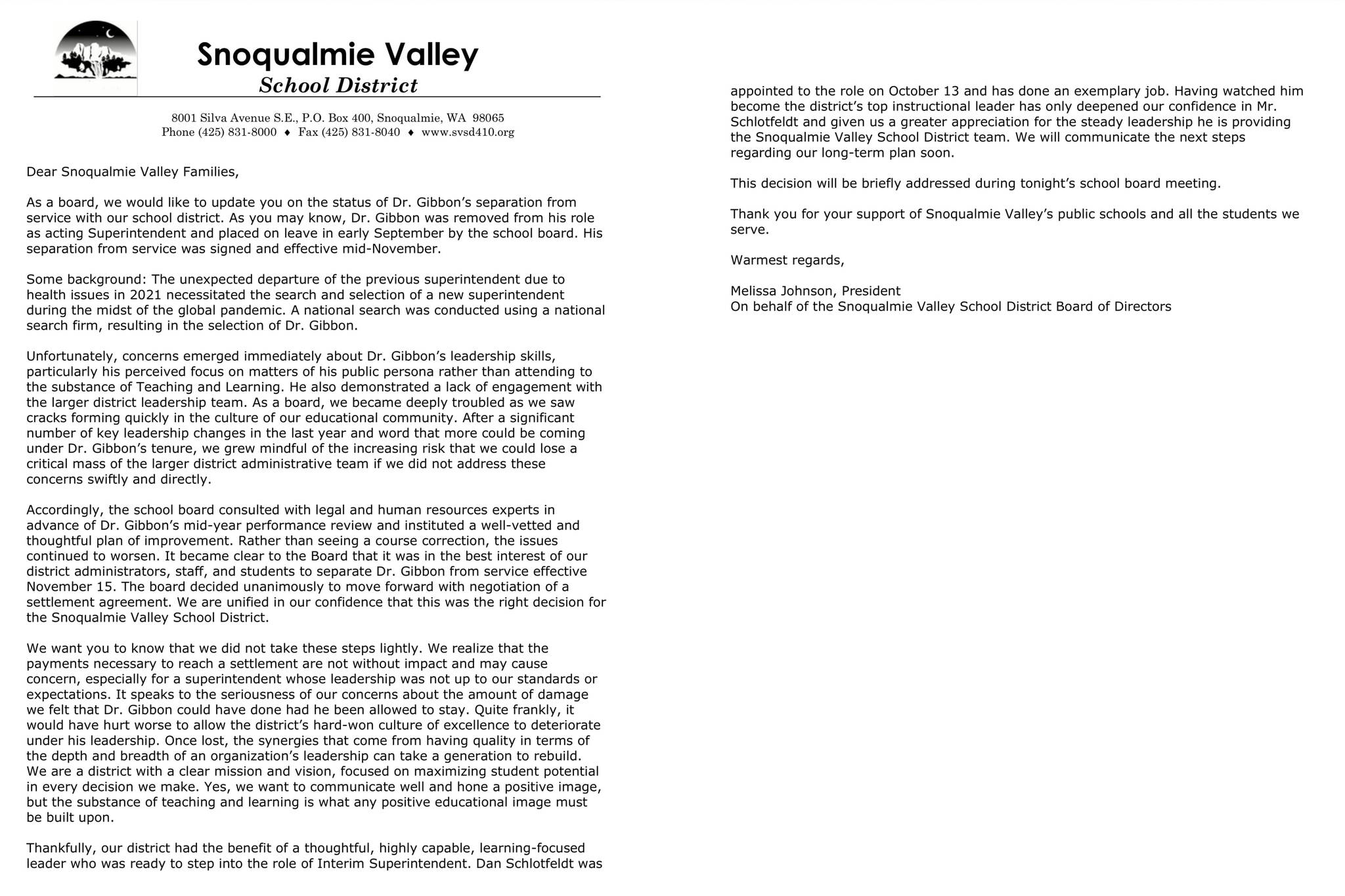 The Snoqualmie school board’s reasoning came in a scathing 640-word letter sent out to district families where the school board offered mostly vague insights into its sudden decision to terminate Gibbon mid-way through the school year.