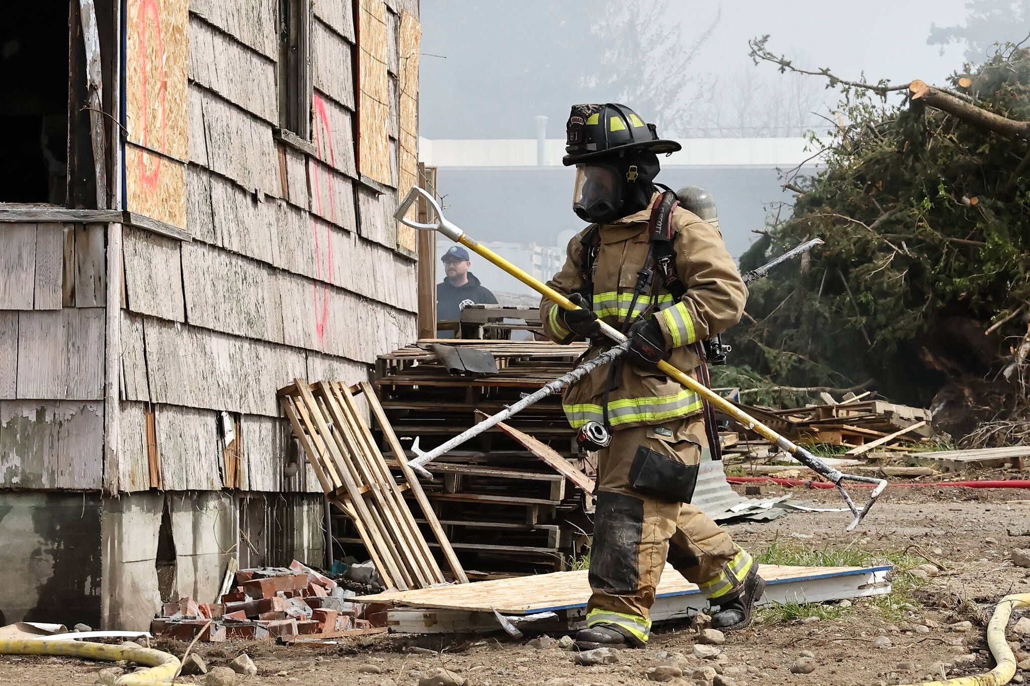 The Oak Harbor Fire Department burned a Southeast Ely Street house to practice extinguishing fires Saturday. Fire Chief Ray Merrill said Oak Harbor firefighters were joined by crews from North Whidbey Fire and Rescue and the Navy fire department, as well as three Oak Harbor council members. In all, about 40 people participated in the practice burn. The owner of the two-story, 1940s house wanted it demolished and offered it to the fire department. Merrill said fire were set in various areas of the house for firefighters to repeatedly extinguish. “Actively going in a real, live fire, with heat and smoke, where we can hear the crackle and see the flames spread across the ceiling, that’s just absolutely wonderful training,” the chief said.