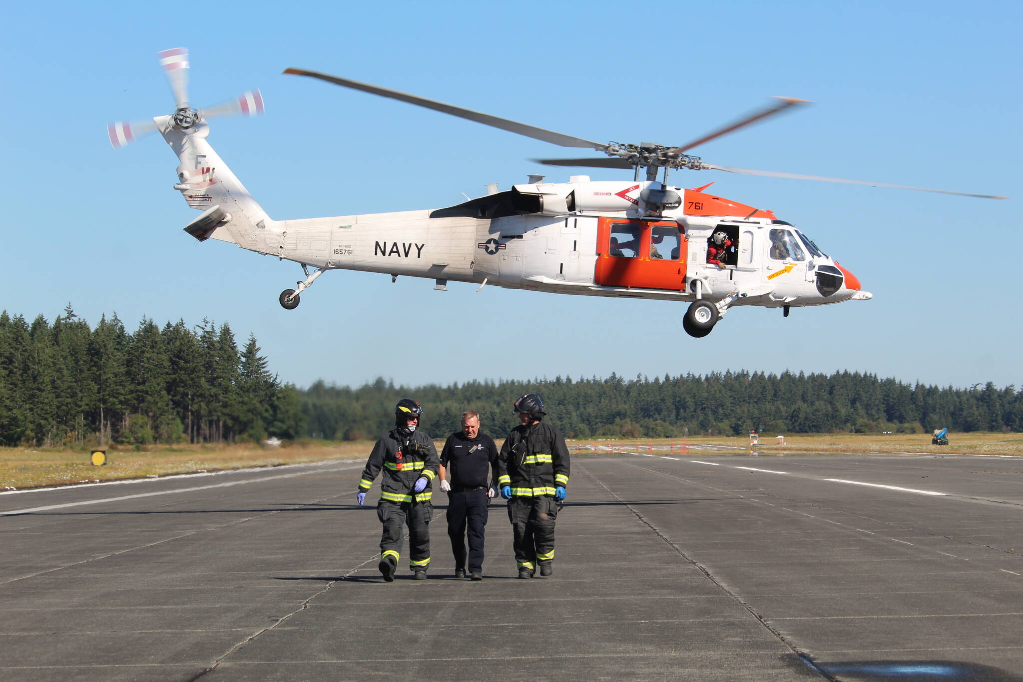 Central Whidbey Island Fire and Rescue, WhidbeyHealth, Island County Sheriff’s Office and Navy Search and Rescue joined Navy firefighters at Outlying Field Coupeville the morning of Aug. 17, where a burning helicopter, two life-sized dummies and a number of Navy personnel with painted-on wounds were strewn across the airstrip.