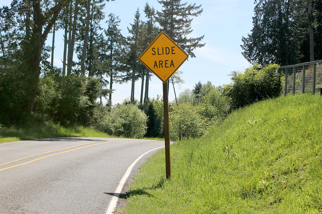 Evan Thompson / The Record — A sign warns of potential landslides on Possession Road. Island County would not permit the Port of South Whidbey to transport tons of concrete down the road for the resurfacing of Possession Point Waterfront Park’s boat launch during the wetter winter months for fear of landslides.
