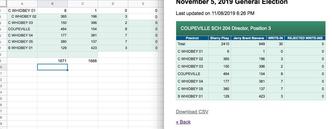 “I am a data analyst,” Cyr said in a text message. “So when I discovered that the precinct counts in the South Whidbey School Board race did not total up to the posted total, I actually started shaking. Because I was worried that the total was wrong and that the results of the race would be reversed.”