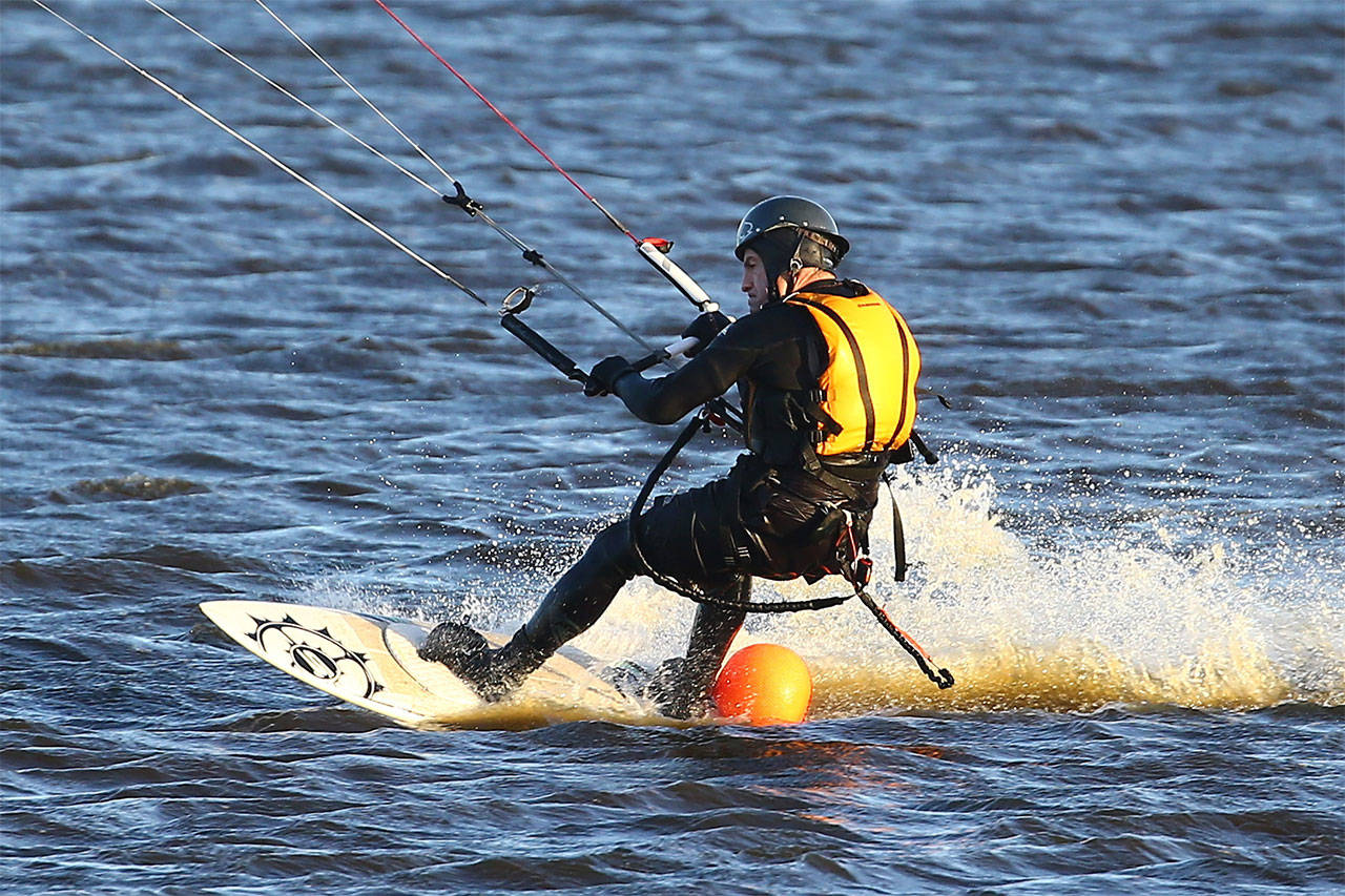 A surfer makes the most of recent stormy weather buffeting Whidbey Island by hitting the water off West Beach on Monday and putting the wind to work.