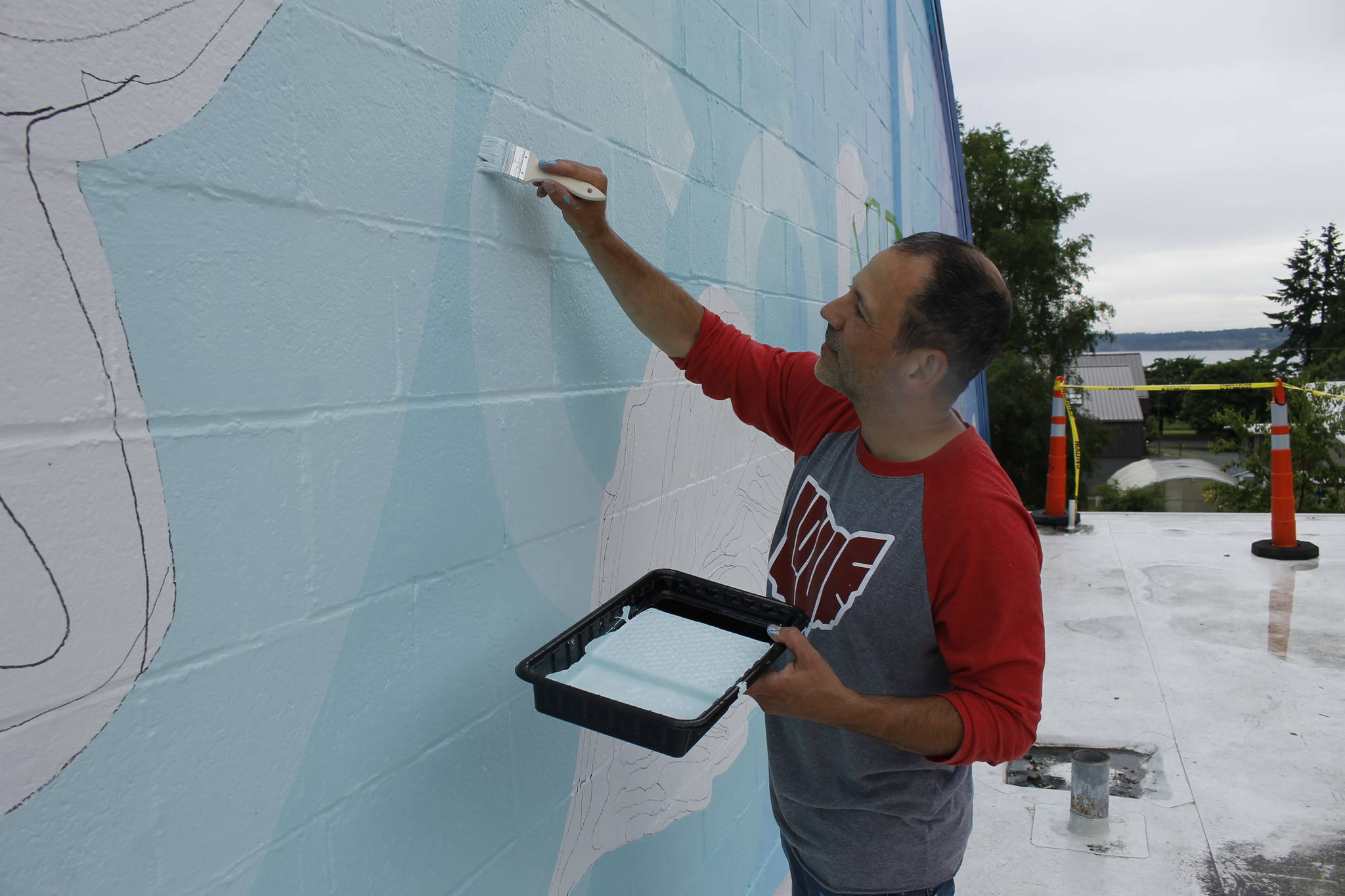 Jeremy Jarvis works on his mural in Langley. (Photo by Kira Erickson/Whidbey News-Times)