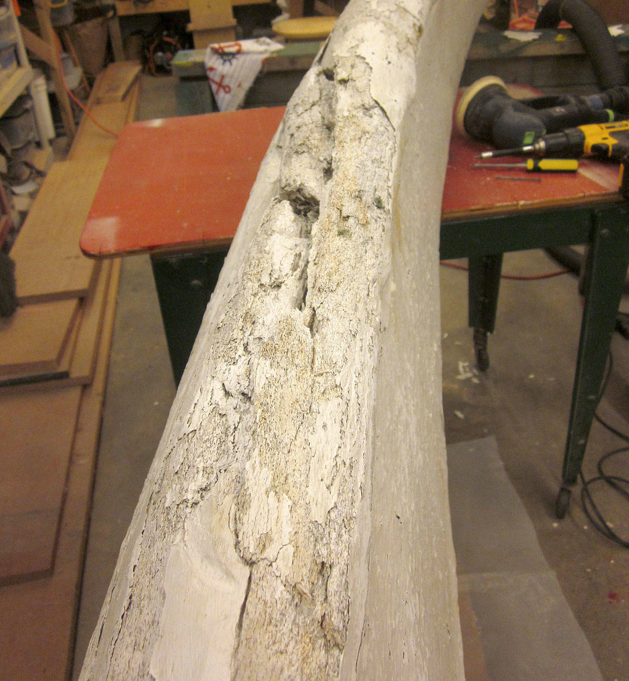 Price tackled the bone as if it were the bottom of a boat. First, all the previous paint and other repair layers were scraped off. To hold some parts in place, he pinned it together with screws and epoxy; decayed sections got a mixture of wood flour (crushed up walnuts) and epoxy resin.