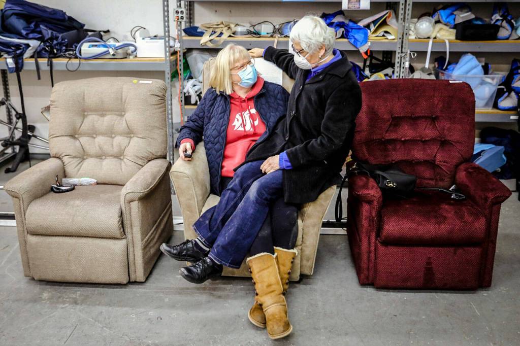 lf you smile, strike up a conversation and have patience, a moment will happen, albeit large or small. In this moment, Sandy Abrahamson, left, and Karen Sticklin test the weight capacity of a lift chair at the MSHH Donor Closet in Edmonds. – Kevin Clark / The Herald.