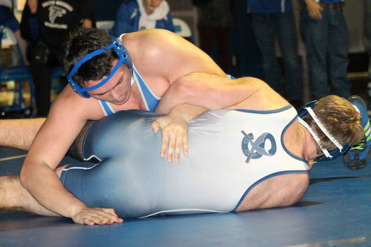 The first to get South Whidbey on the scoreboard was Drew Aposhyan, who pinned Cooper Johnsen in the 132-pound class at the :58 mark.