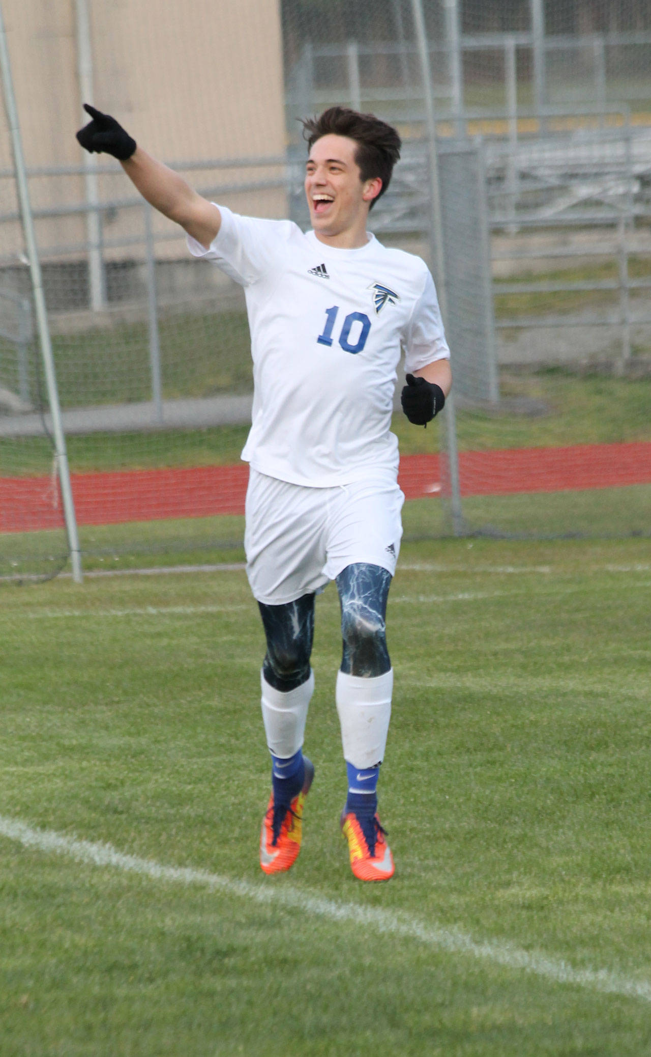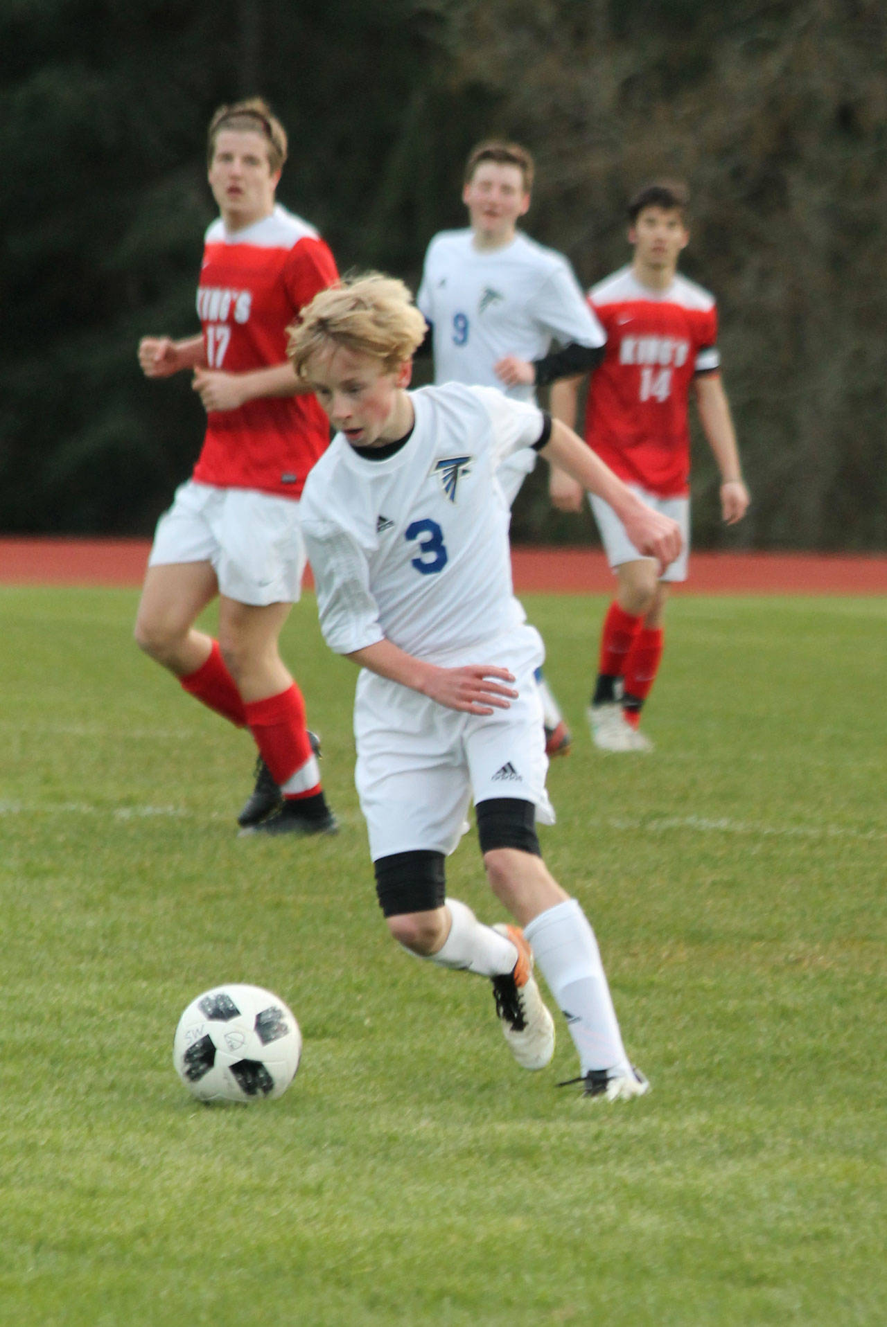 South Whidbey High School soccer coach Emerson Robbins is taking the hit for the Falcons’ 2-1 loss in overtime to visiting King’s Friday, March 23.