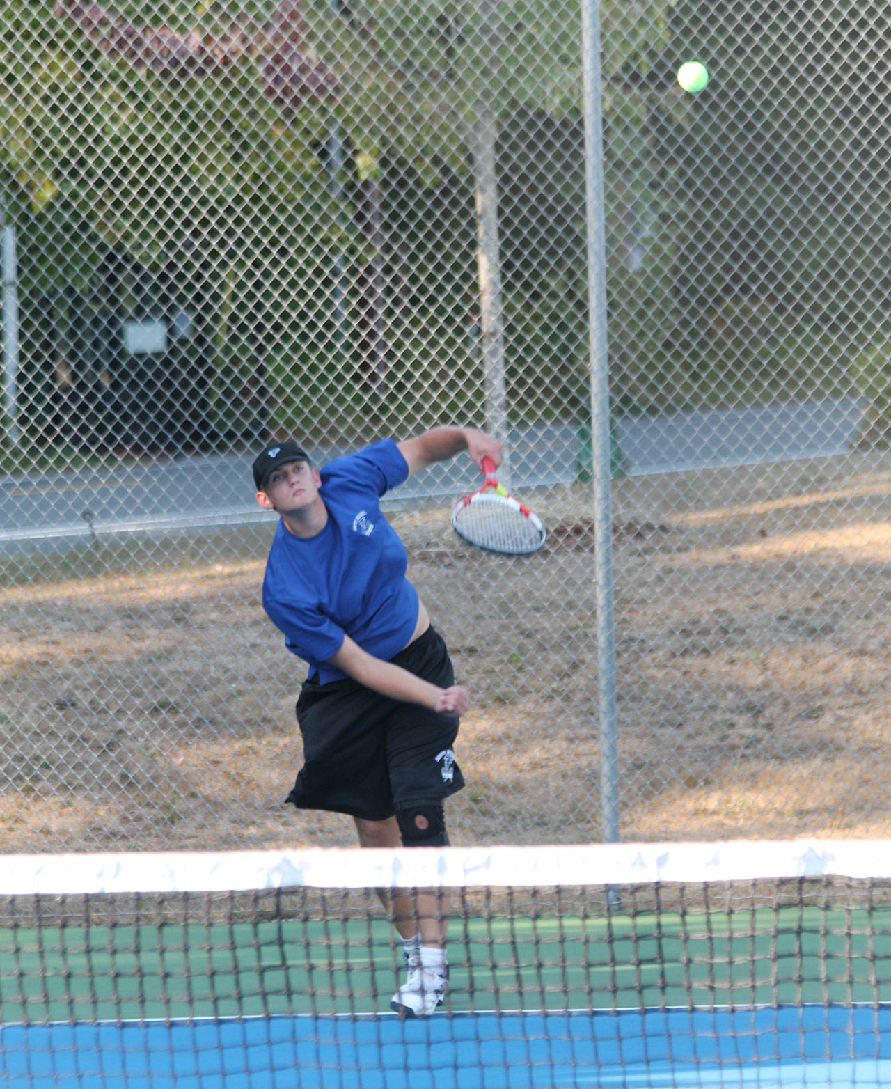 Brent Batchelor rockets a serve in Wednesday’s match.(Photo by Jim Waller/South Whidbey Record)