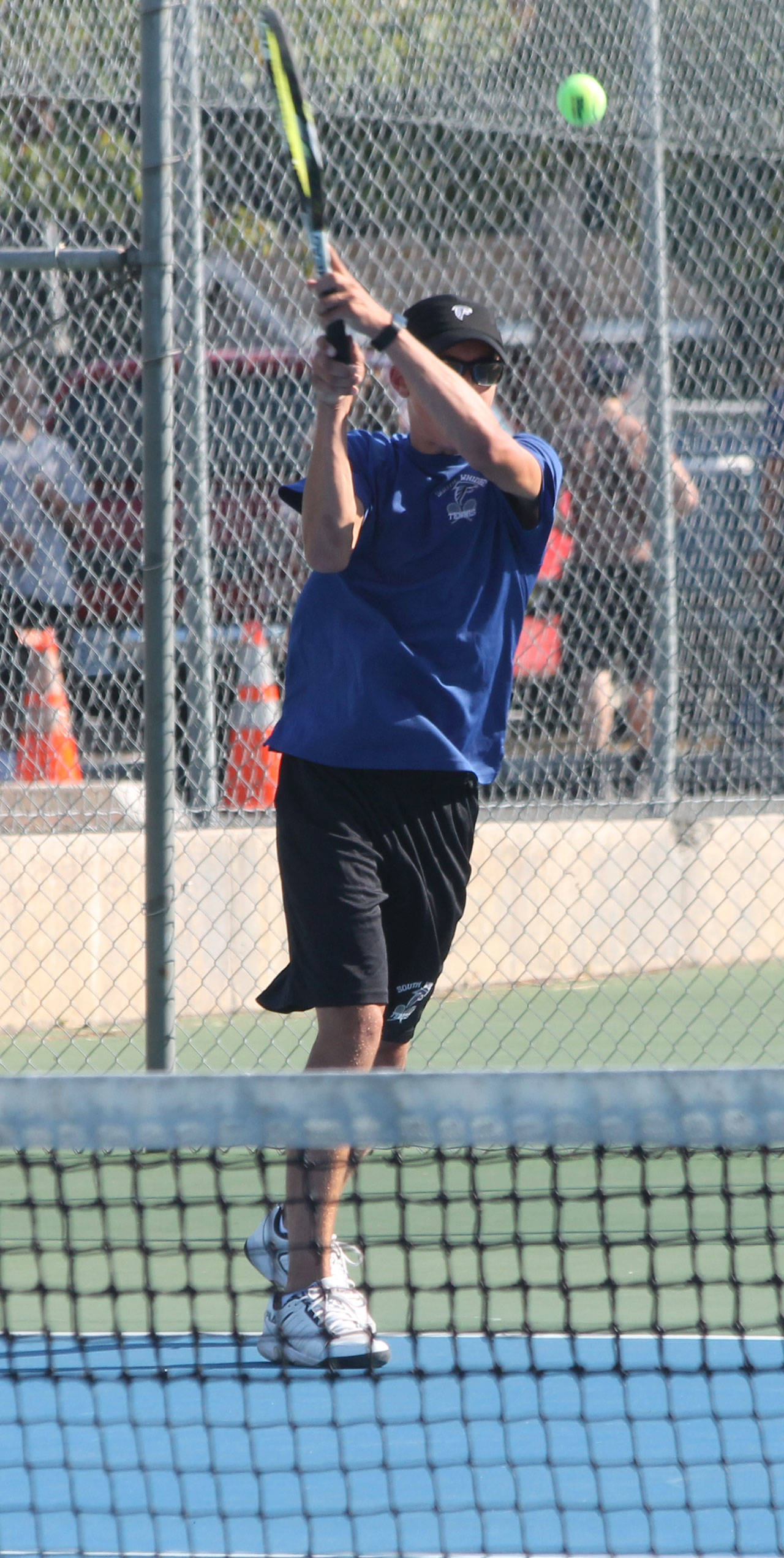 Joey Lane rips a shot in his win in first doubles. (Photo by Jim Waller/South Whidbey Record)