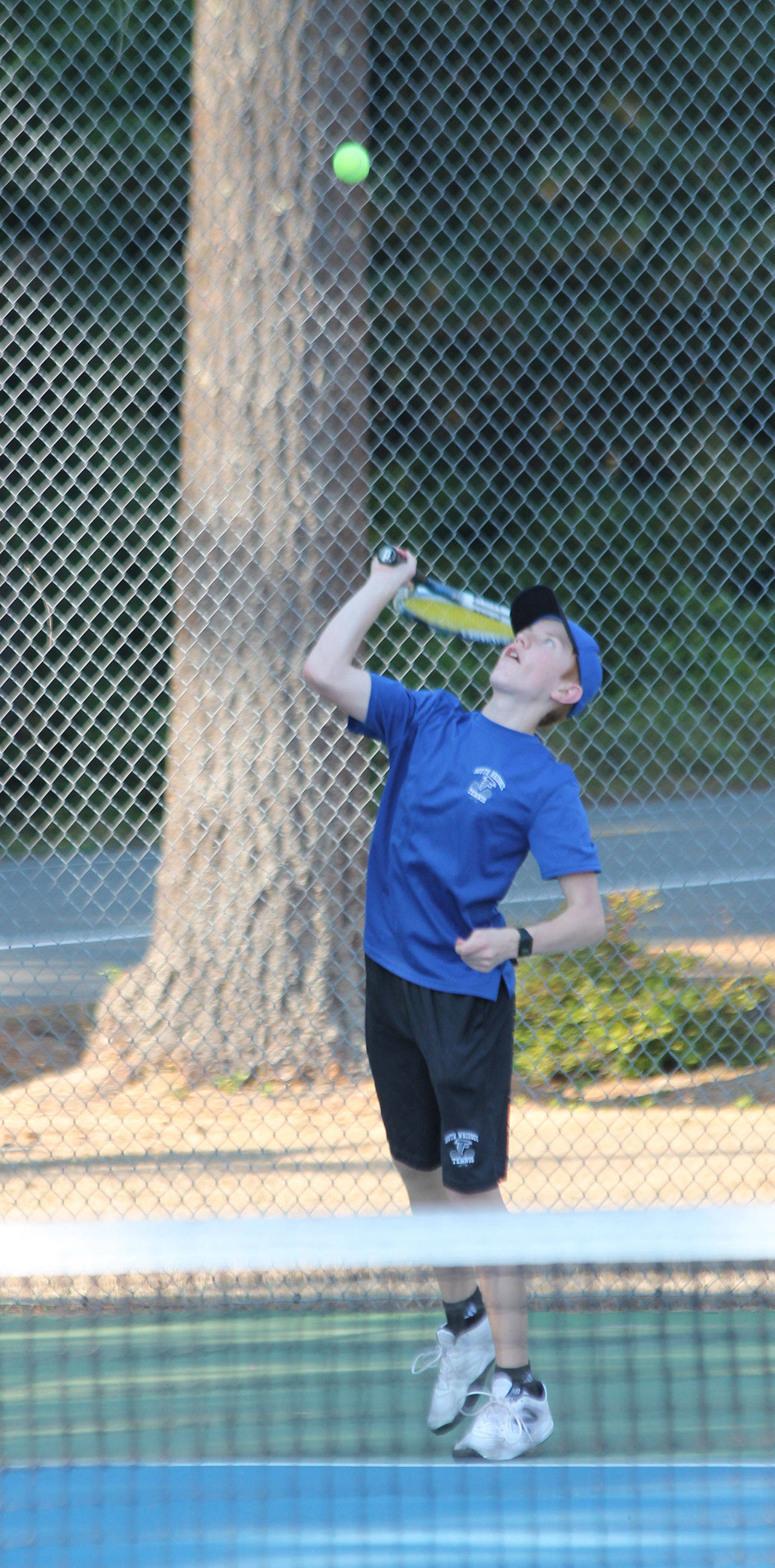Brent Batchelor rockets a serve in Wednesday’s match. (Photo by Jim Waller/South Whidbey Record)